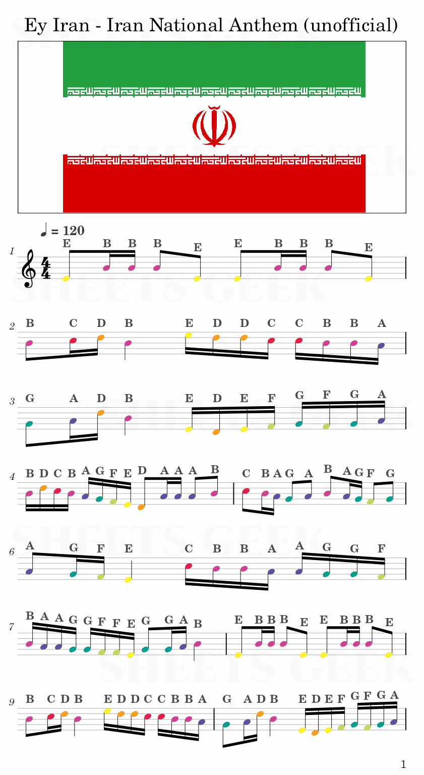 This site is primarily aimed towards beginners, so all the scores posted are simplified versions to make the as easy as possible to play on a large variety of instruments including pianos, keyboards, flute, violins, sax, kalimba, cello and other similar instruments. The notes are also colored so it makes them even more facile to read and follow. For absolute beginners letter notes are also included above the staff.If you find any mistakes on Ey Iran - Iran National Anthem (unofficial) sheet music or you have suggestions on how they can be improved, don't hesitate to leave a comment and we will do our best to implement them in the post.